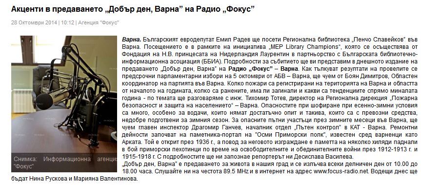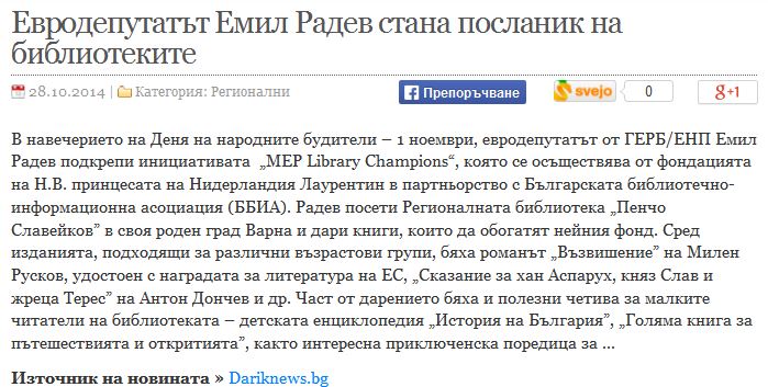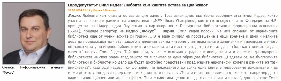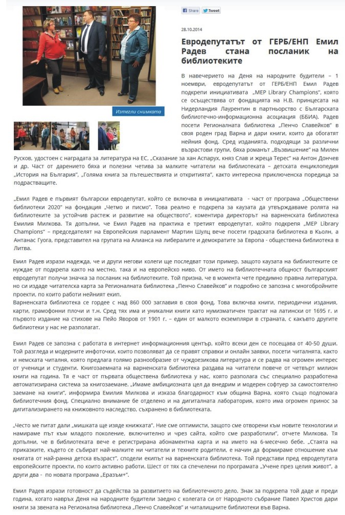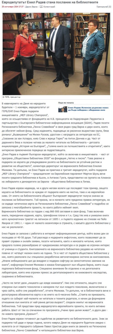 Евродепутатът от ГЕРБ/ЕНП Емил Радев стана посланик на библиотеките. // Dariknews.bg, 28 окт. 2014 [електронен ресурс] |