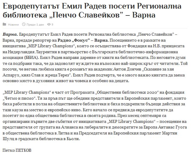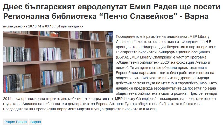 На 28 октомври 2014 г. българският евродепутат г-н Емил Радев посети Регионална библиотека “Пенчо Славейков” - Варна. Посещението е в рамките на инициатива „MEP Library Champions“, която се осъществява от Фондация на Н.В. принцесата на Нидерландия Лаурентин в партньорство с Българската библиотечно-информационна асоциация (ББИА). „MEP Library Champions“ е част от Програма „Обществени библиотеки 2020“ на фондация „Четмо и писмо“. Тя за пръв път ще обедини представители в Европейския парламент, които биха работили в полза на обществените библиотеки и биха подкрепили бъдещи действия за тази кауза на местно и европейско ниво.