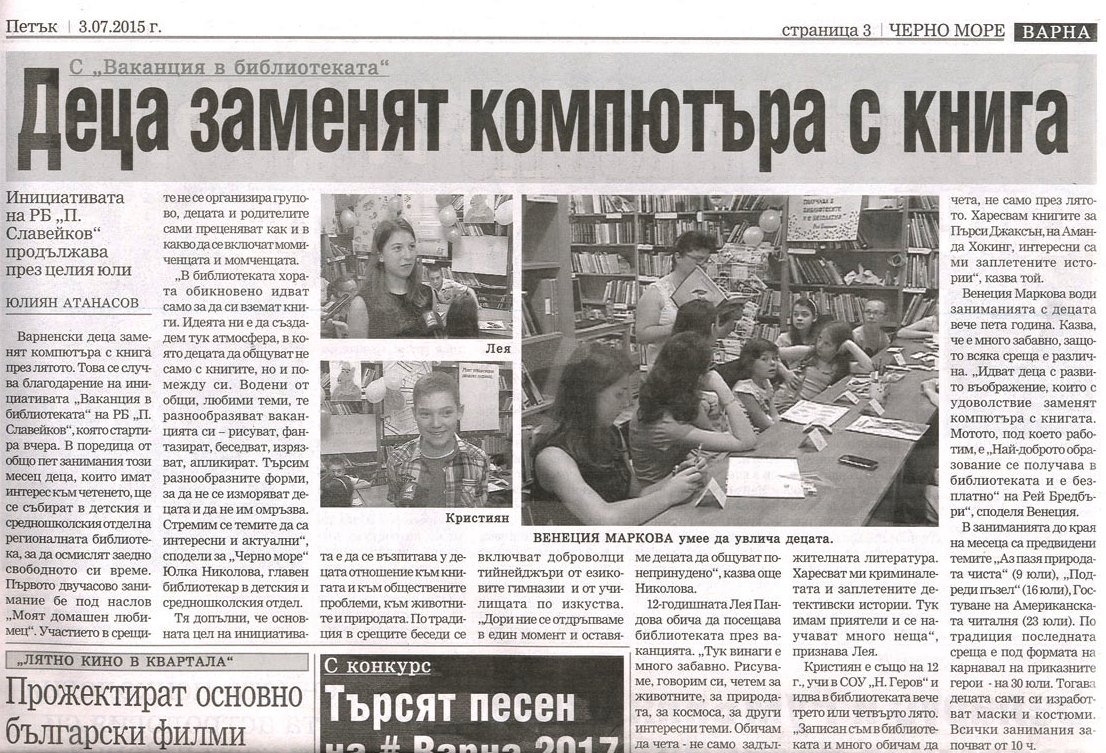 Атанасов, Юлиян. С "Ваканция в библиотеката" : Деца заменят компютъра с книга / Юлиян Атанасов. // Черно море (Варна), XVII, № 124 (5075), 3 юли 2015, с. 1, 3. |