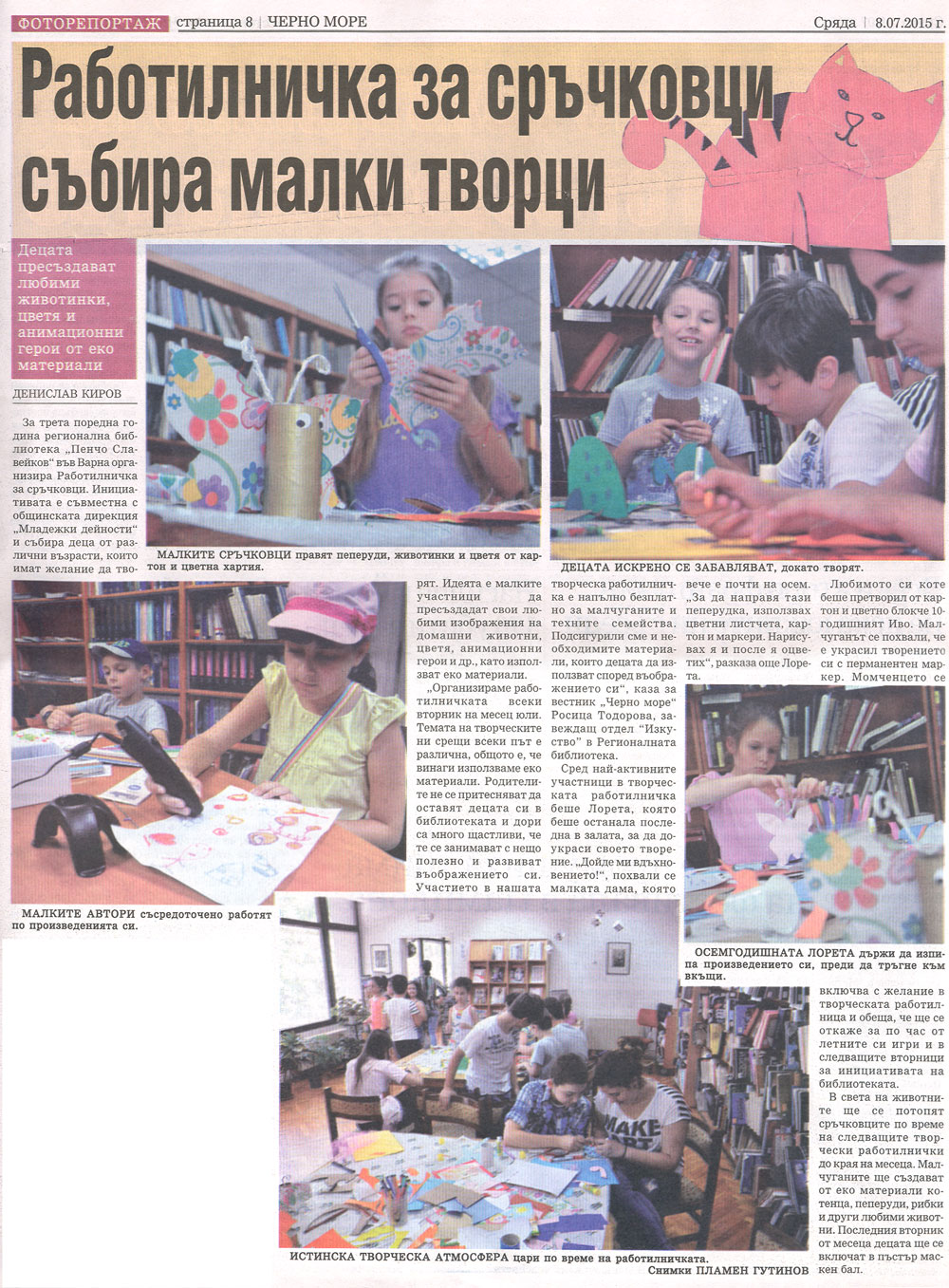 Киров, Денислав и др. Работилничка за сръчковци събира малки творци / Денислав Киров ; Фотогр. Пламен Гутинов. // Черно море (Варна), XVII, № 127 (5078), 8 юли 2015, с. 1, 8. |