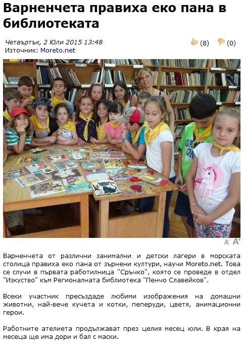 Варненчета правиха еко пана в библиотеката // moreto.net, 2 юли 2015. |