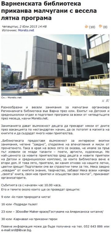 Варненската библиотека приканва малчугани с весела лятна програма // moreto.net, 2 юли 2015. |