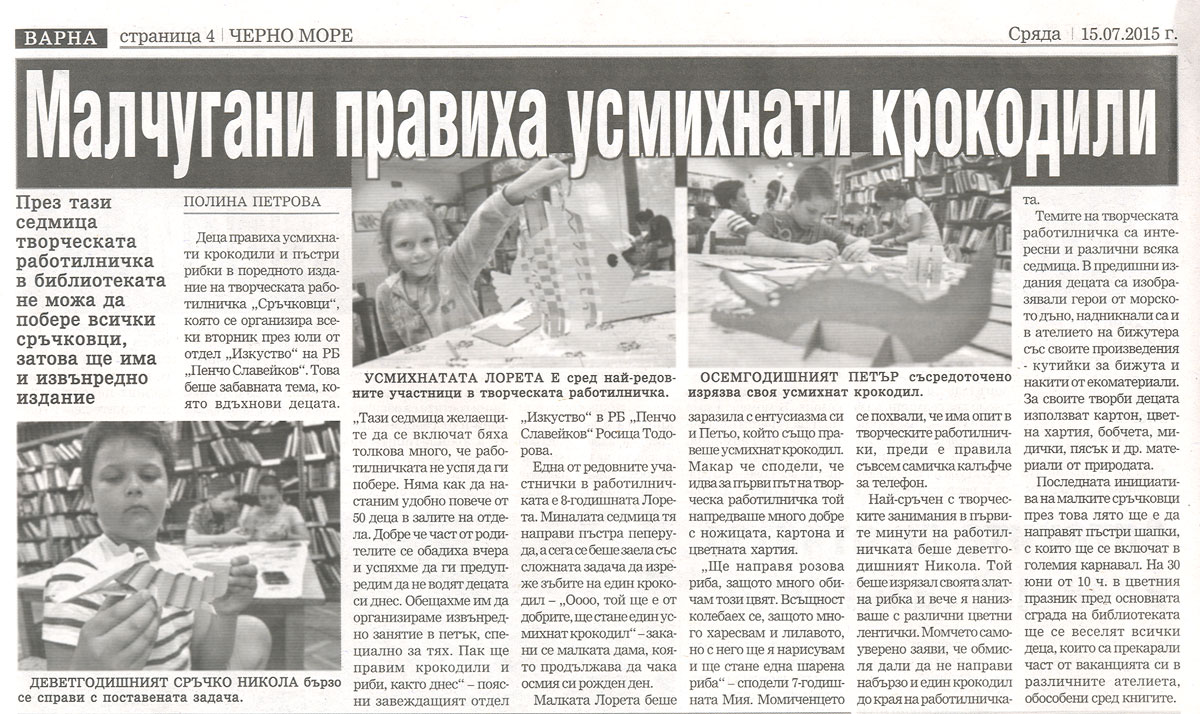 Петрова, Полина. Малчугани правиха усмихнати крокодили / Полина Петрова. // Черно море (Варна), XVII, № 132 (5083), 15 юли 2015, с. 4. |