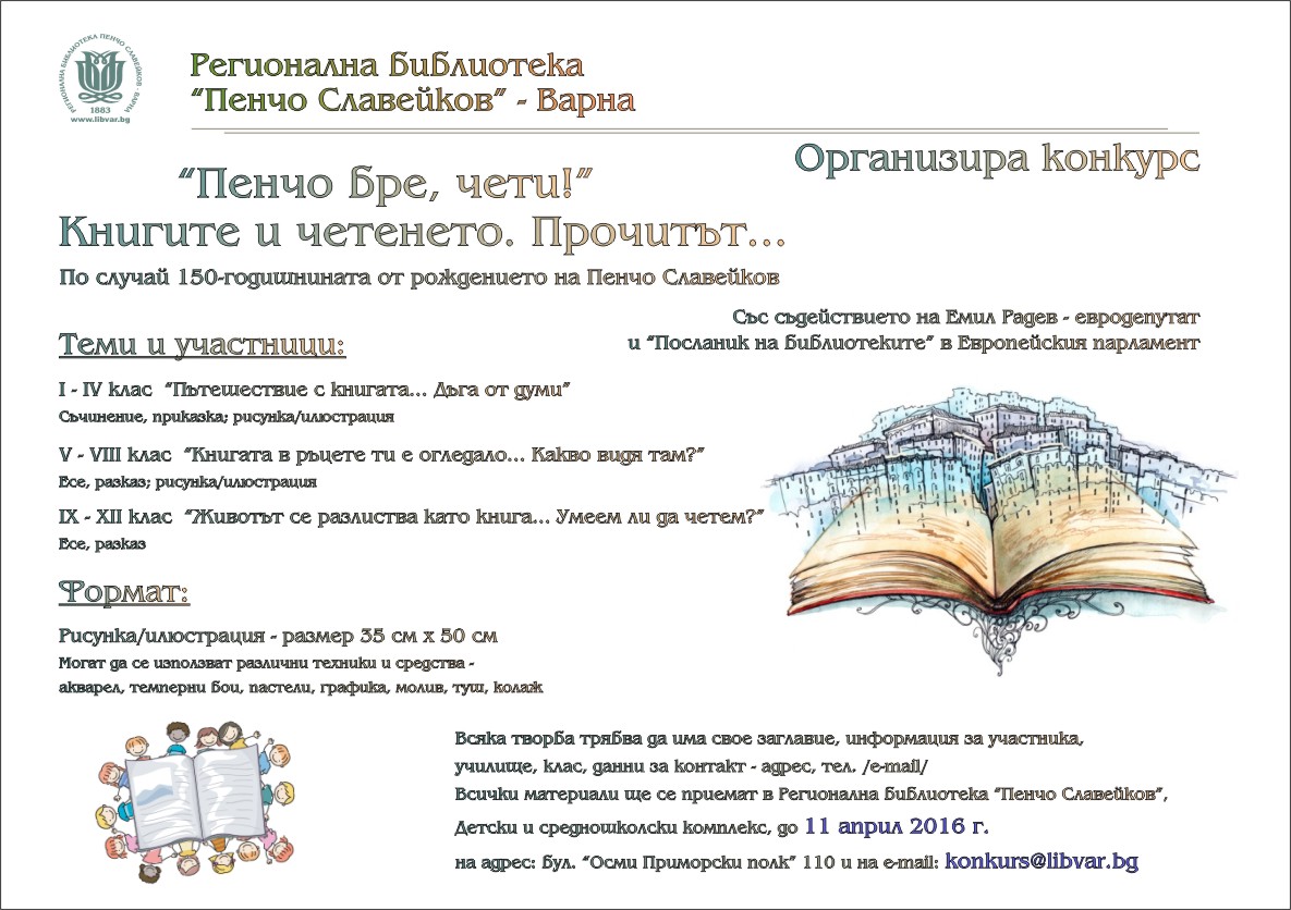 Всички материали ще се приемат в Регионална библиотека “Пенчо Славейков”, Детски и средношколски комплекс, до 11 април 2016 г. на адрес: