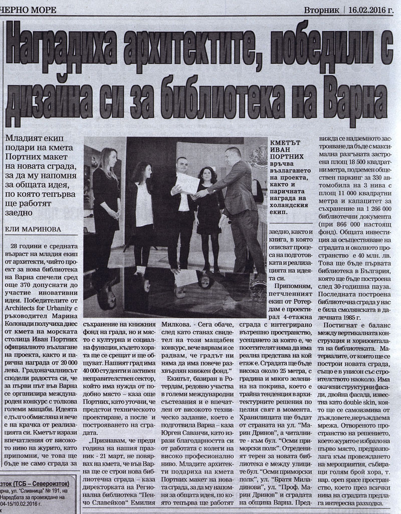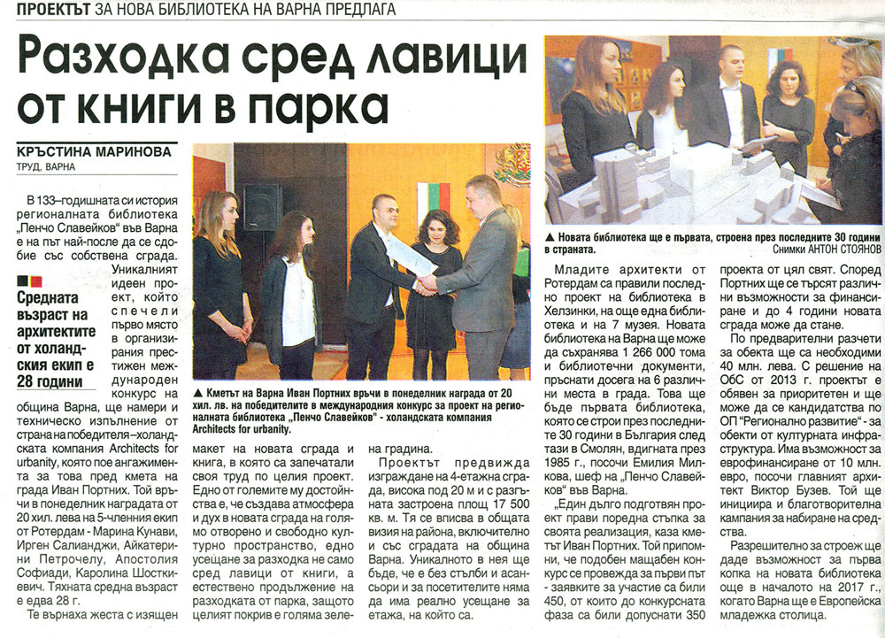 На 15 февруари 2016 г. Иван Портних - кмет на Варна връчи наградата на холандското архитектурно бюро “Architects for Urbanity” – победител в международния архитектурен конкурс за идеен проект на нова сграда на Регионалната библиотека „Пенчо Славейков“. Младите архитекти декларираха готовност да реализират техническото проектиране на сградата, което трябва да приключи до края на годината.