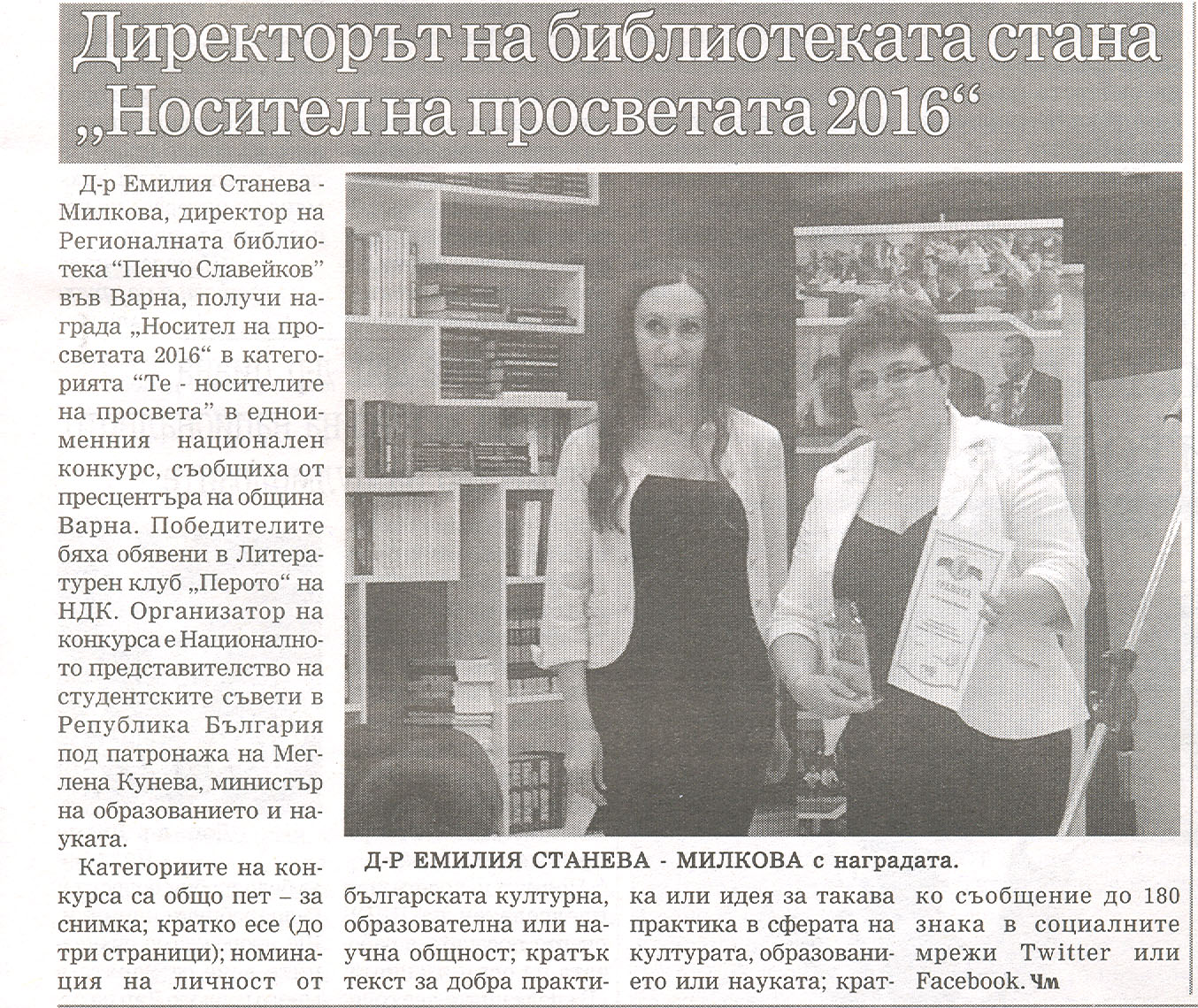 Директорът на библиотеката стана "Носител на просвета 2016".// Ч е р н о м о р е (Варна), XVIII, N 109, 13 юни 2016, с. 3. |