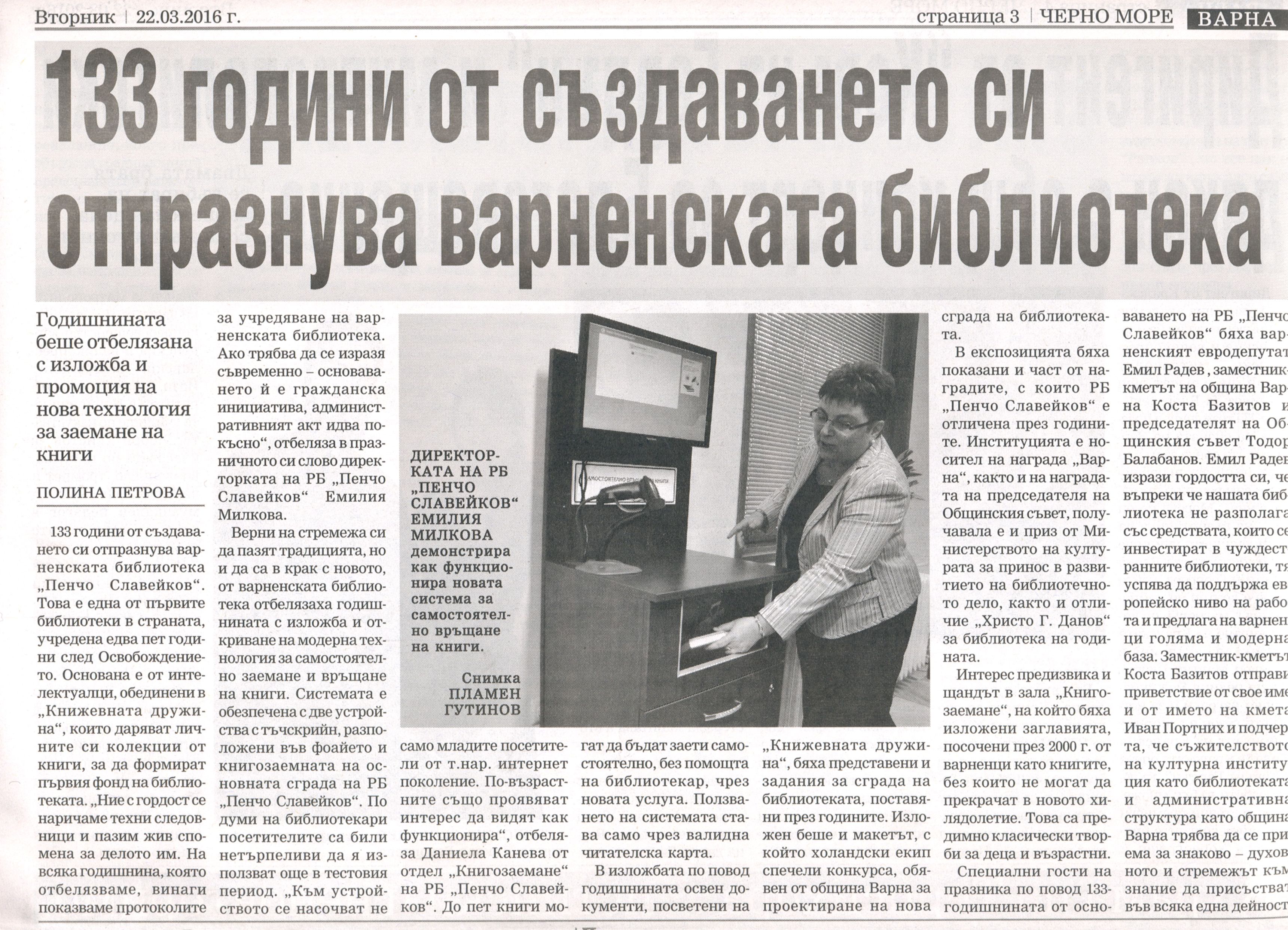 Петрова, Полина. 133 години от създаването си отпразнува варненската библиотека : Годишнината беше отбелязана с изложба и промоция на нова технология за заемане и връщане на книги / Полина Петрова. // chernomore.bg, 21 март 2016. |