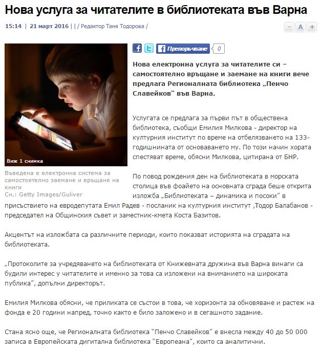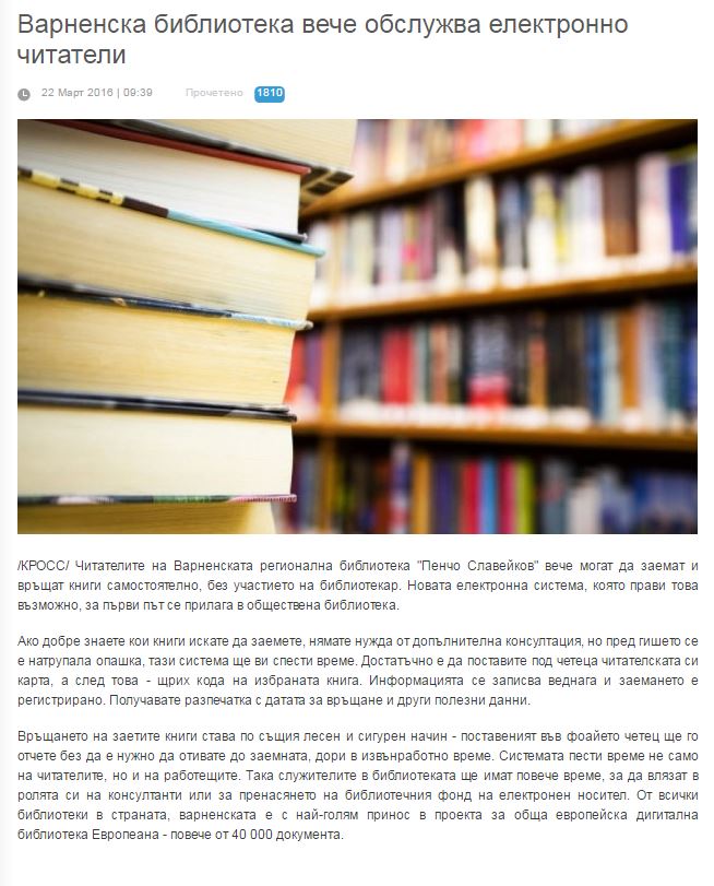Варненска библиотека вече обслужва електронно читатели. // cross.bg, 22 март 2016. |
