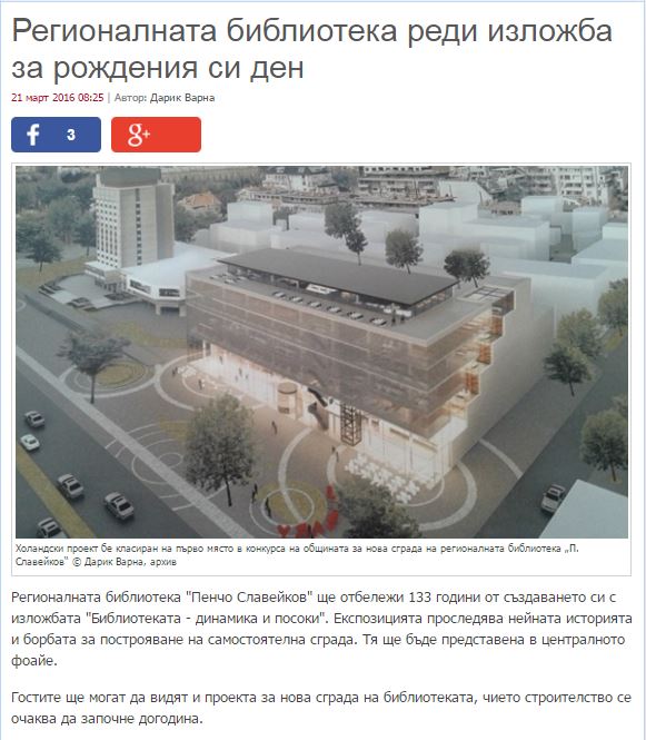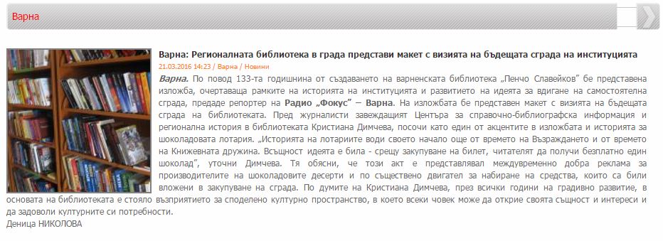 Николова, Деница. Регионалната библиотека в града представи макет с визията на бъдещата сграда на институцията / Деница Николова. // focus-radio.net, 21 март 2016. |