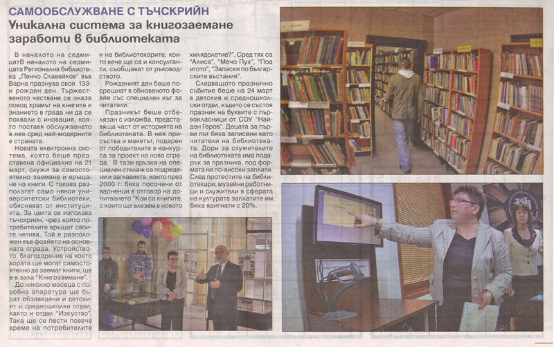 Уникална система за книгозаемане заработи в библиотеката : Самообслужване с тъчскрийн. // Нар. дело (Варна), LXXII, N 13, 28 март-3 април 2016, с. 17. |