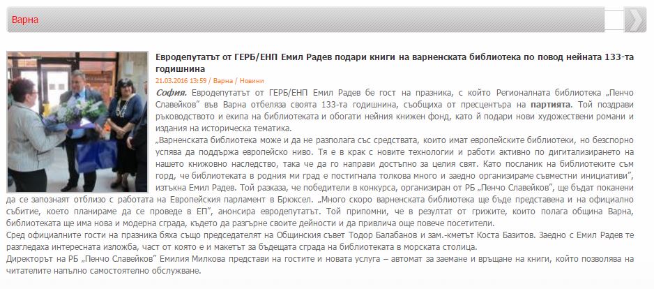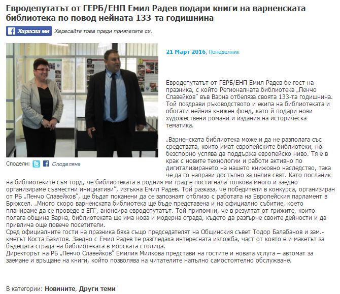 Евродепутатът от ГЕРБ/ЕНП Емил Радев подари книги на варненската библиотека по повод нейната 133-та годишнина. // vlastta.com, 21 март 2016. http://www.vlastta.com/displaynews/103018 |