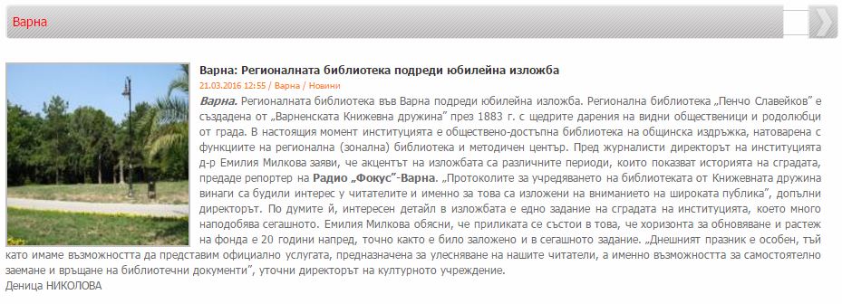 Регионалната библиотека реди изложба за рождения си ден. // dariknews.bg, 21 март 2016. http://dariknews.bg/view_article.php?article_id=1560883 Също и в: Varna24.bg; dnesplus.bg. http://www.varna24.bg/novini/varna/Regionalnata-biblioteka-redi-izlozhba-za-rozhdeniya-si-den-627089 |