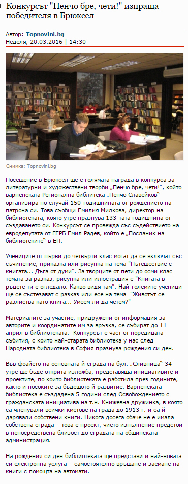 Конкурсът "Пенчо бре, чети!" изпраща победителя в Брюксел. // topnovini.bg, 20 март 2016. |