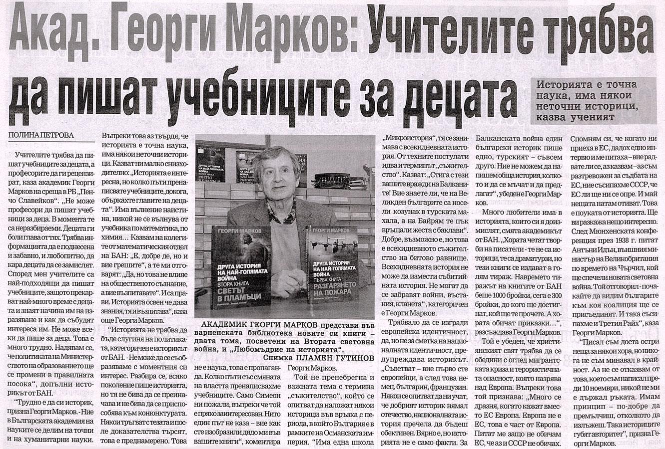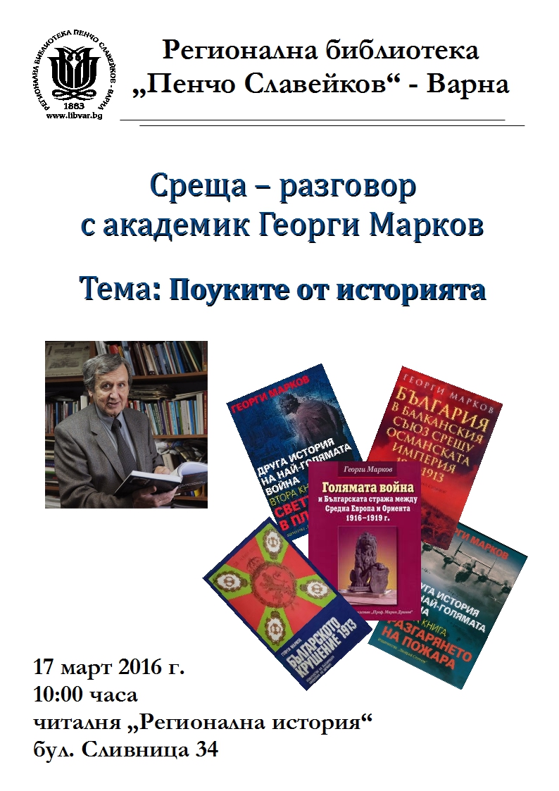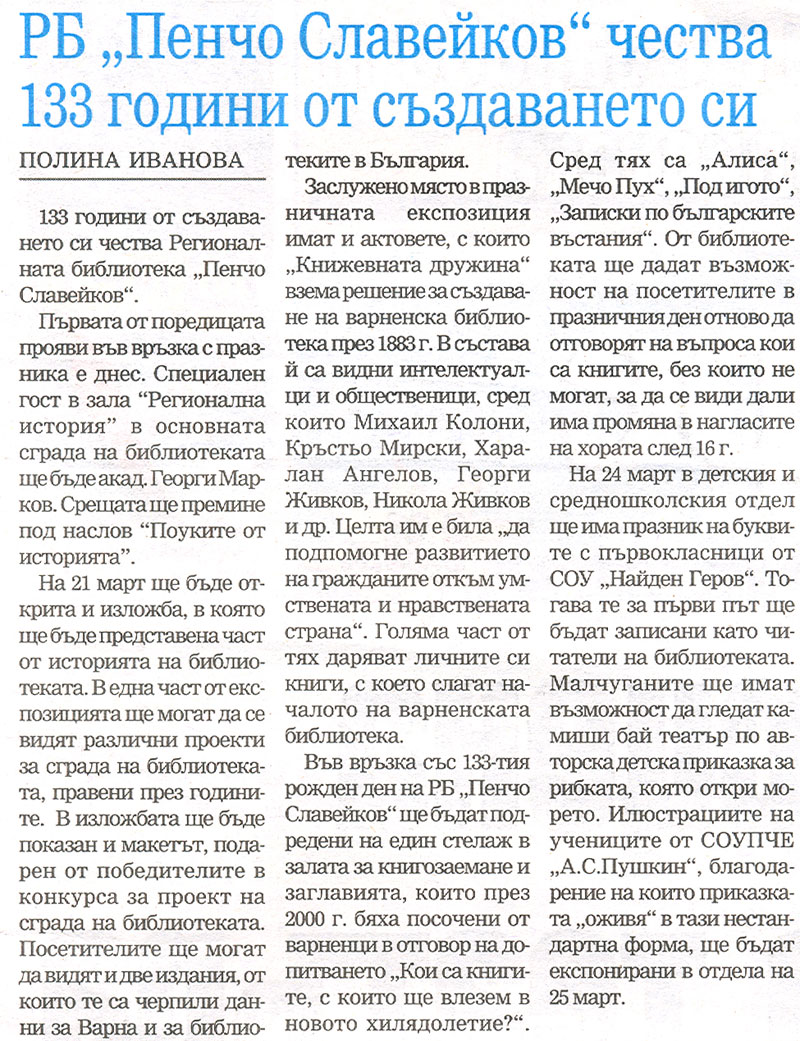 Иванова, Полина. РБ "Пенчо Славейков" чества 133 години от създаването си / Полина Иванова. // Черно море (Варна), XVII, N 52, 17 март 2016, с. 2. |