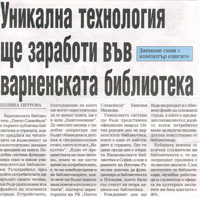 Варненската библиотека въвежда електронна система за самостоятелно заемане и връщане на книги. // bnr.bg, 16 март 2016. |