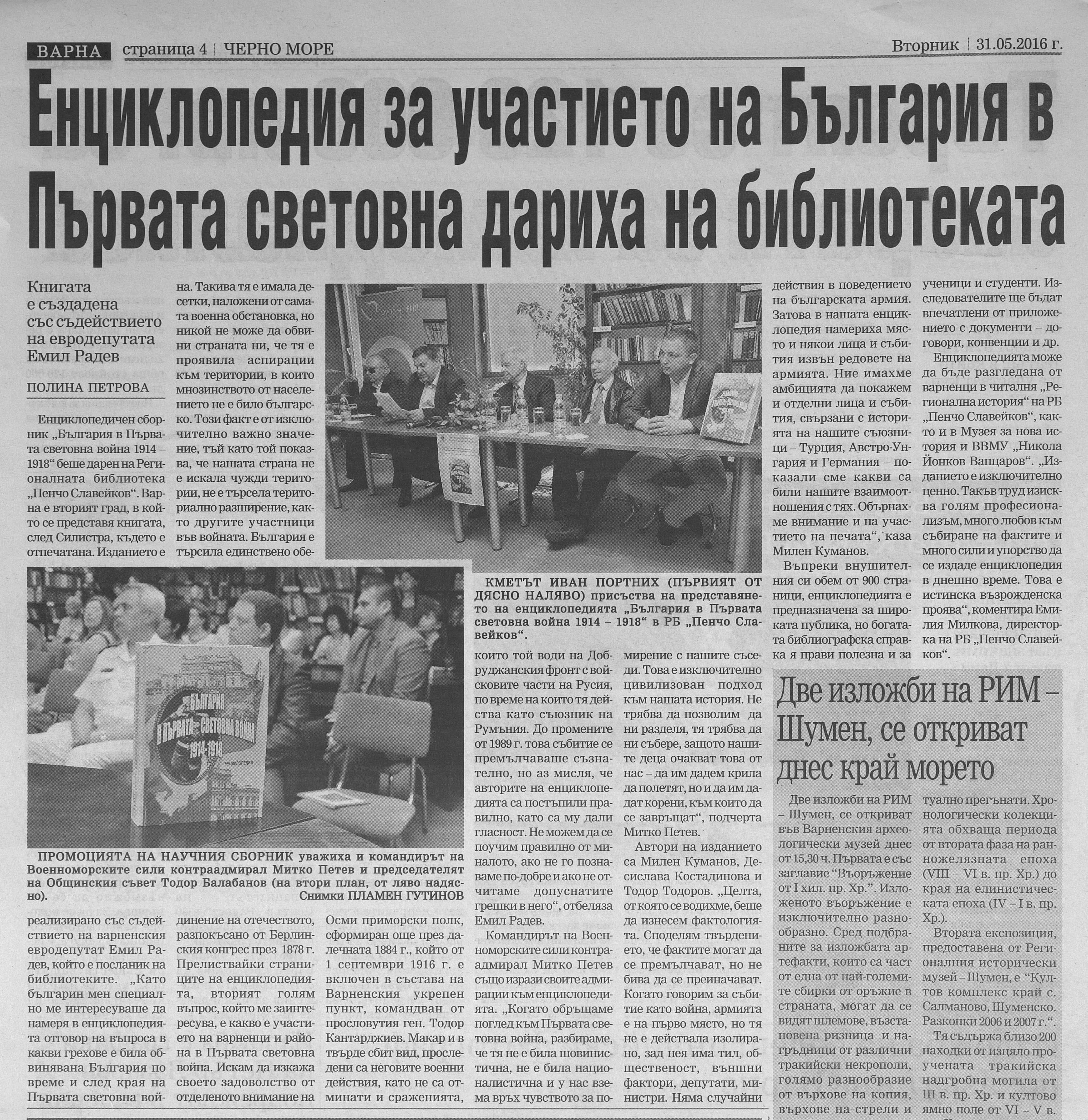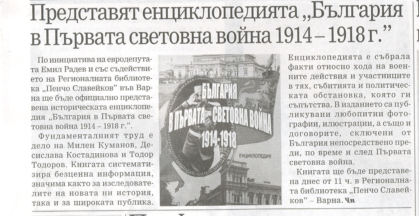 В Регионалната библиотека „Пенчо Славейков” по инициатива на евродепутата от ГЕРБ/ЕНП Емил Радев официално бе представена историческата енциклопедия „България в Първата световна война 1914 – 1918 г.” Представянето на книгата „България в Първата световна война 1914 – 1918 г.” е второто у нас след организираното в Силистра, където е издадена.