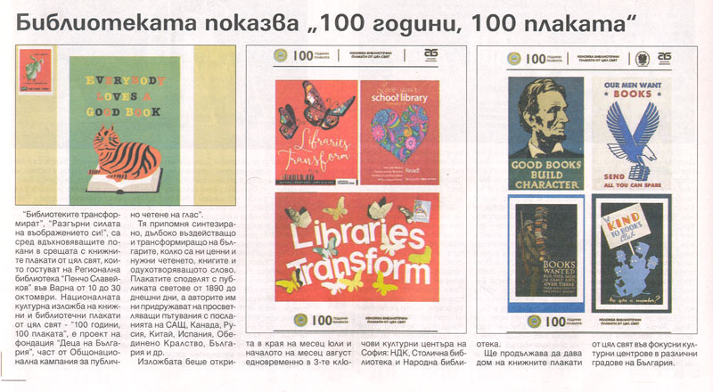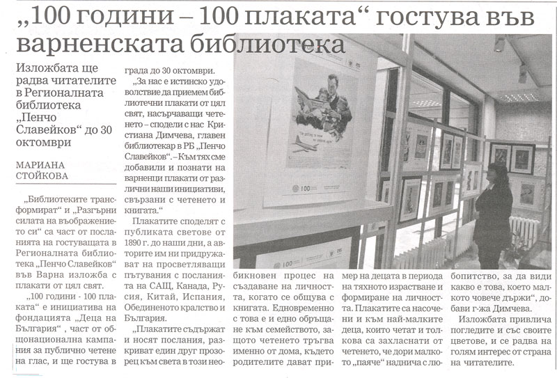 Библиотеката показа "100 години, 100 плаката". // Нар. дело (Варна), LXXII, N 42, 17-23 окт. 2016, с. 16 : с ил. |