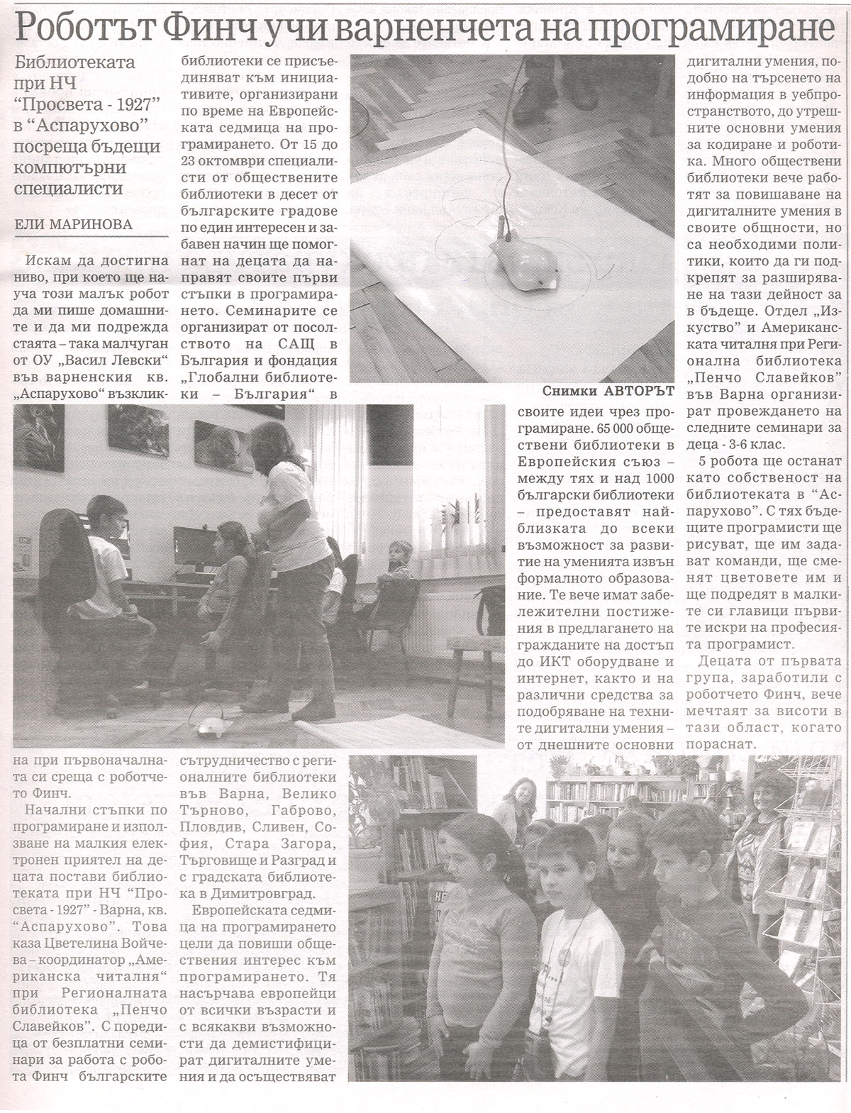 Маринова, Ели. Роботът Финч учи варненски деца на програмиране : Библиотеката при НЧ “Просвета - 1927” в Аспарухово посреща бъдещи програмисти / Ели Маринова. // chernomore.bg, 17 окт. 2016. |