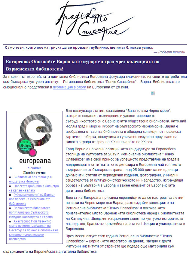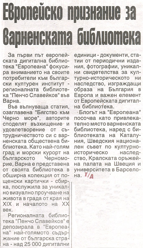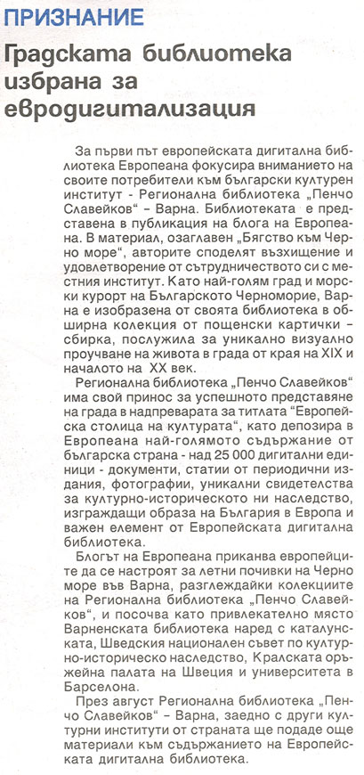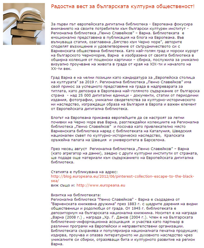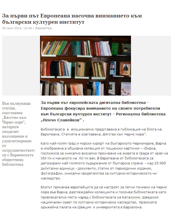 За първи път европейската дигитална библиотека - Европеана фокусира вниманието на своите потребители към колекцията на Регионална библиотека "П. Славейков" – Варна. |