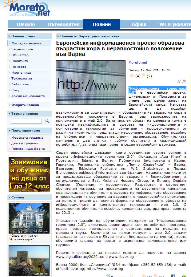 Европейски информационен проект образова възрастни хора в неравностойно положение във Варна. // Moreto.net, 17 май 2013.