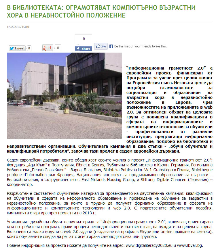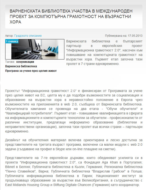 Варненската библиотека участва в международен проект за компютърна грамотност на възрастни хора. // Градското списание , 17 май 2013.