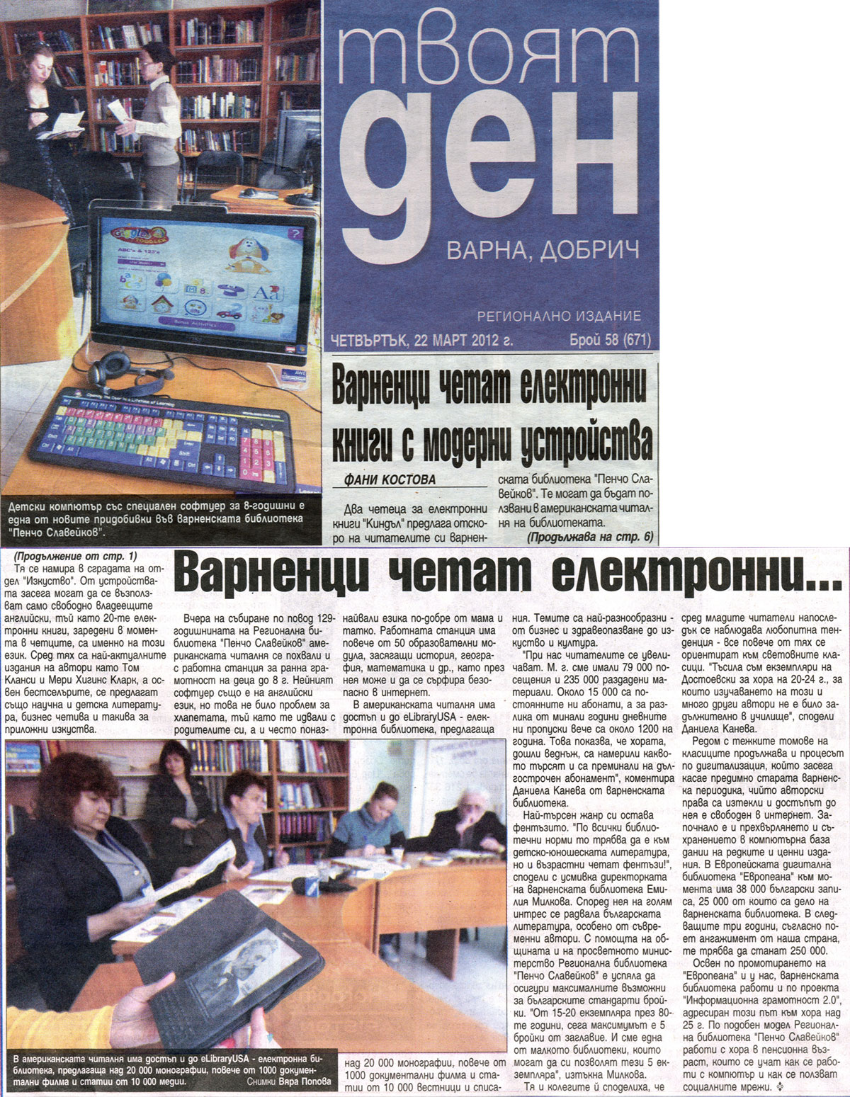 Костова, Фани. Варненци четат електронни книги с модерни устройства / Фани Костова. // Твоят ден (Варна), N 58, 22 март 2012, с. 1, 6, със сн.