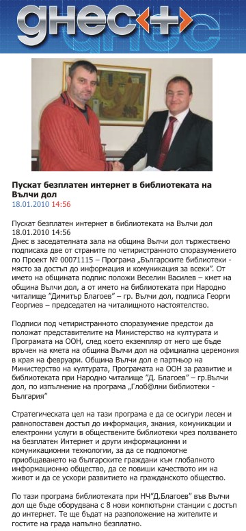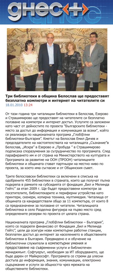 По програма "Глоб@лни библиотеки". вж. и 3 библиотеки в община Белослав ще предоставят безплатно интернет [Електронен ресурс] http://more.info.bg/article.asp?topicID=267&issueID=2742, 18.01.2010 |