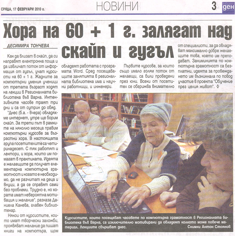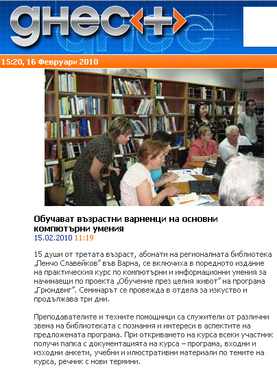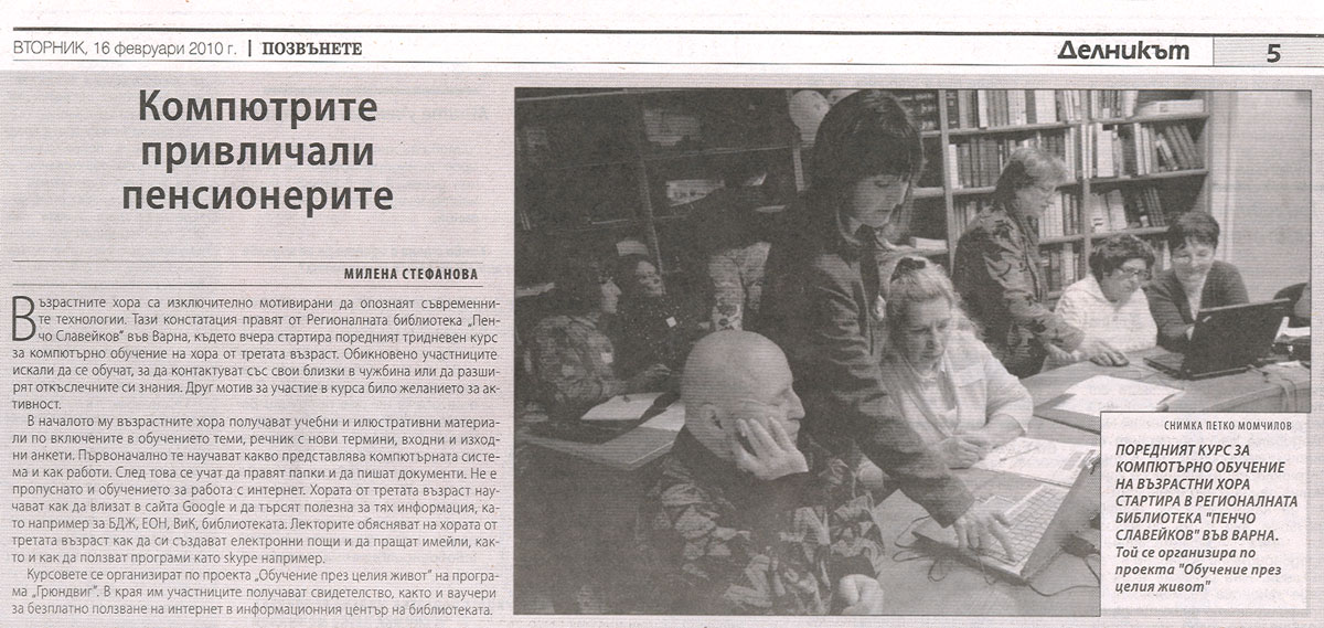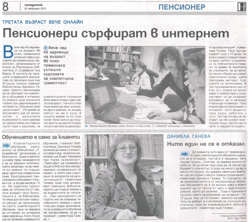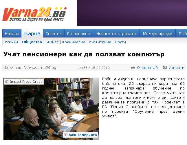 УЧАТ пенсионери как да ползват компютър. [Електронен източник] http://news.varna24.bg/142760.html, 15.02.2010 |