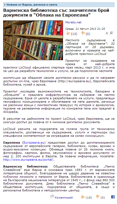 Варненска библиотека със значителен брой документи в "Облака на Европеана". // moreto.net, 21 август 2013 |