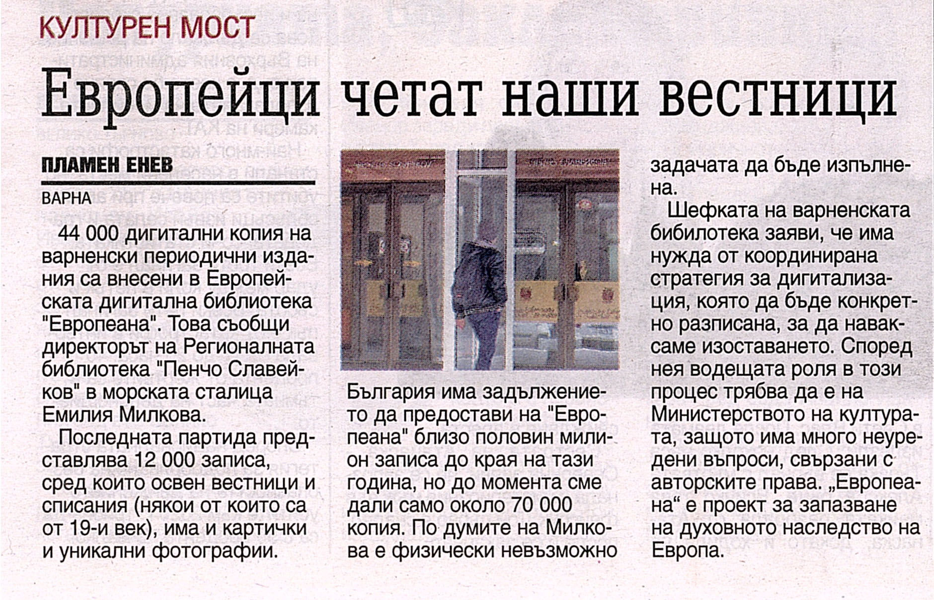 Енев, Пламен. Европейци четат наши вестници / Пламен Енев. // Труд, N 4, 21 януари 2015, с. 9 |