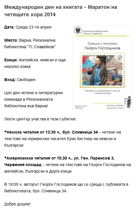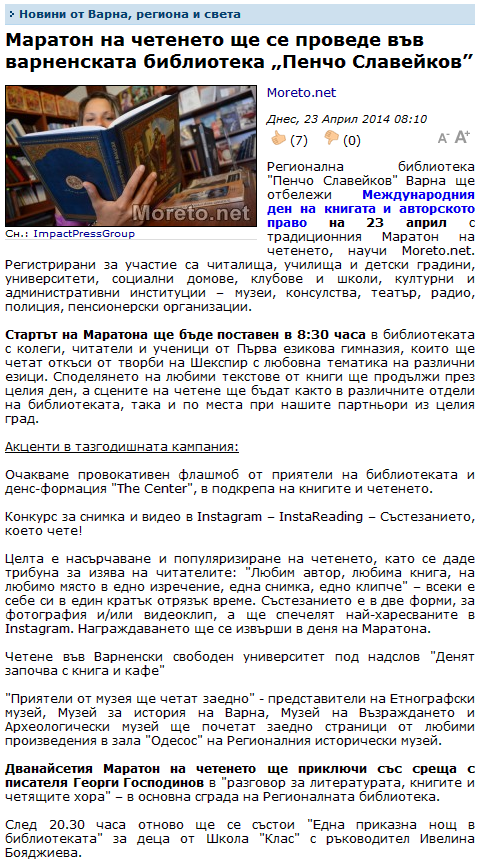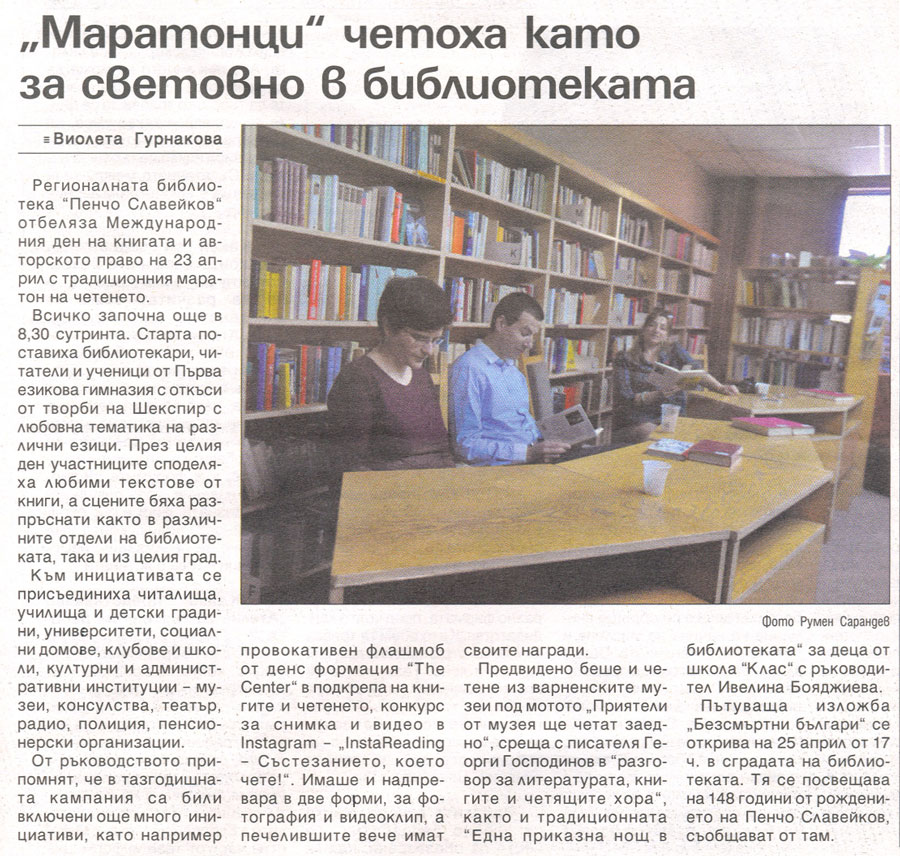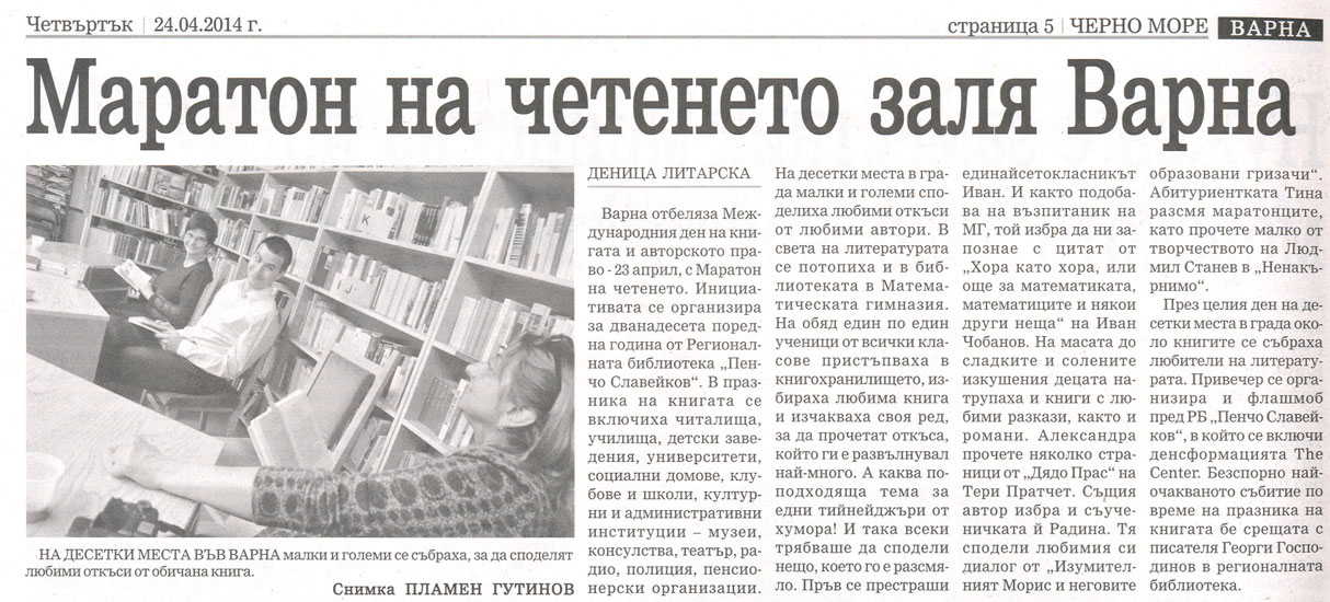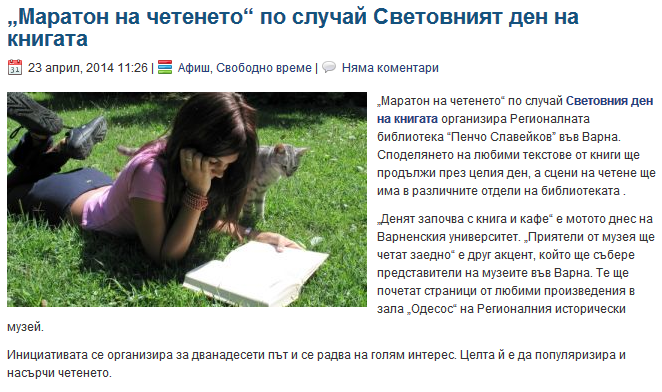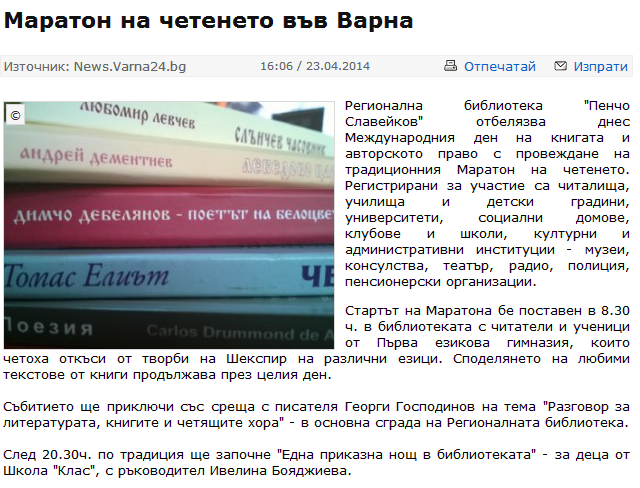Библиотеката организира Маратон на четенето. // Live.Varna.bg, 23 април 2014