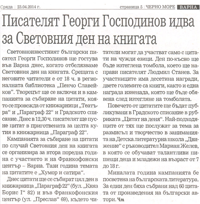Писателят Георги Господинов идва за Световния ден на книгата. // Черно море (Варна), XVI, бр 89 (4780), 23 април 2014, с. 5 За гостуването на Георги Господинов в Регионална библиотека "Пенчо Славейков" по повод дванайсетото издание на Маратона на четенето.