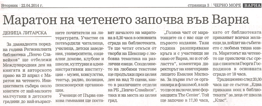 Маратон на четенето във Варна. // Varna24.bg, 23 април 2014