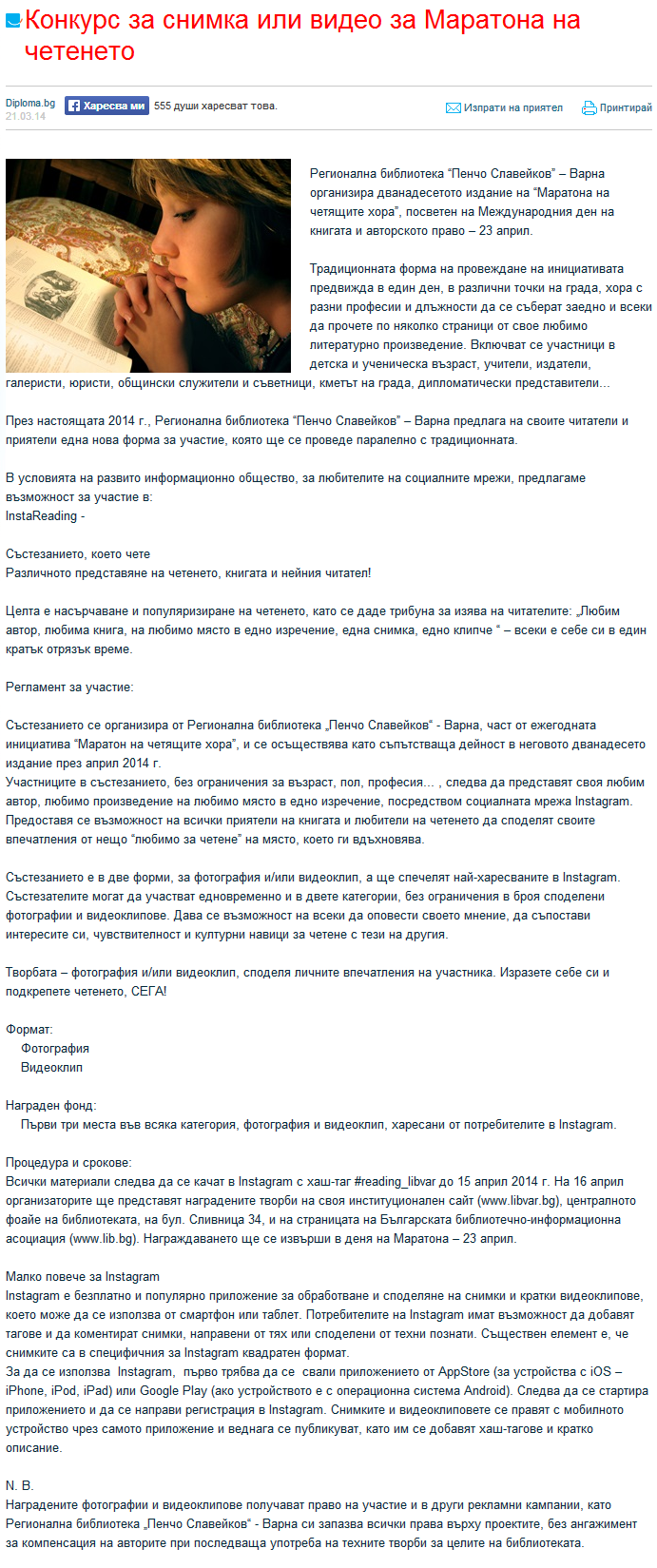 Конкурс за снимка или видео за Маратона на четенето. // Diploma.bg, 21 март 2014