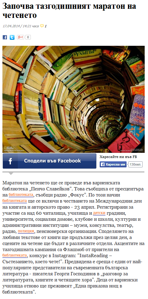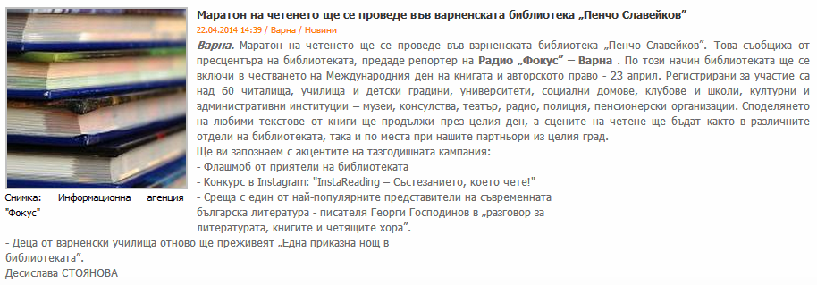 Маратон на четенето ще се проведе във варненската библиотека „Пенчо Славейков”. // Focus-radio.net, 22 април 2014