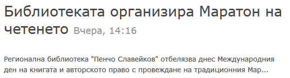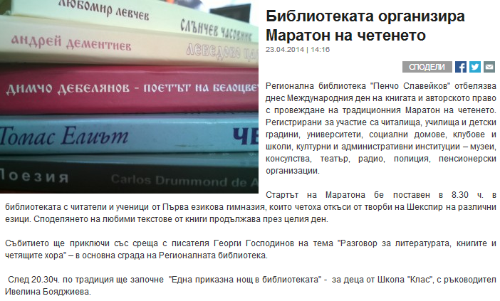 Библиотеката организира Маратон на четенето. // Novinitednes.net, 23 април 2014