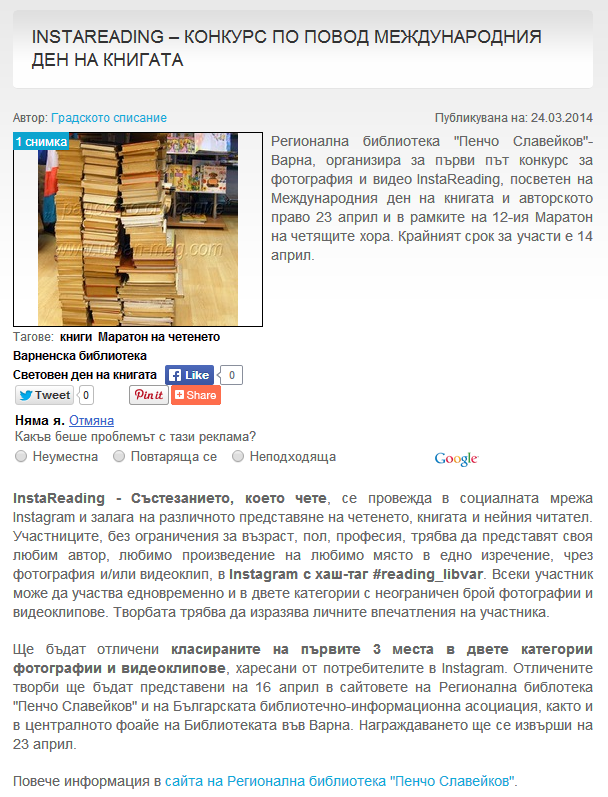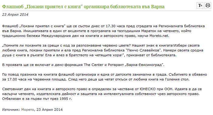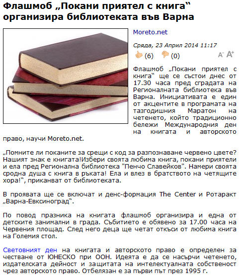 Флашмоб „Покани приятел с книга“ организира библиотеката във Варна. // Moreto.net, 23 април 2014