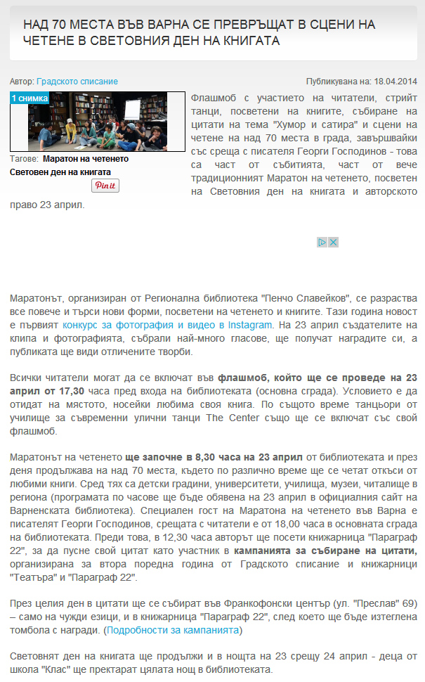 Над 70 места във Варна се превръщат в сцени на четене в Световния ден на книгата. // Urban-mag.com, 18 април 2014