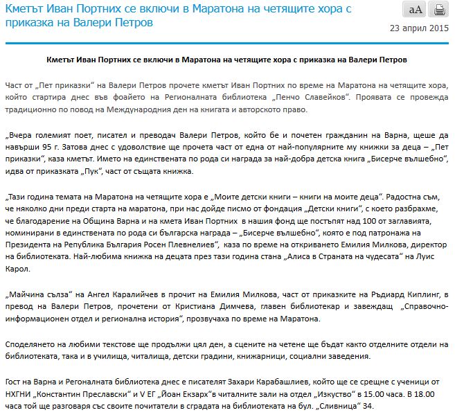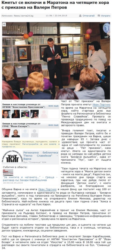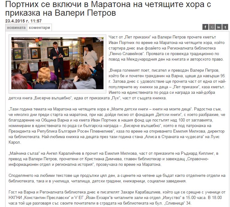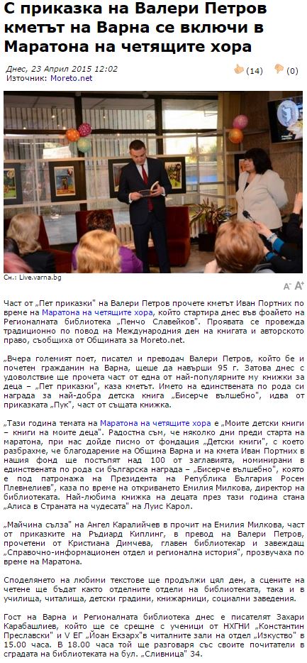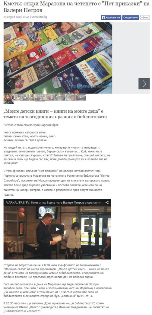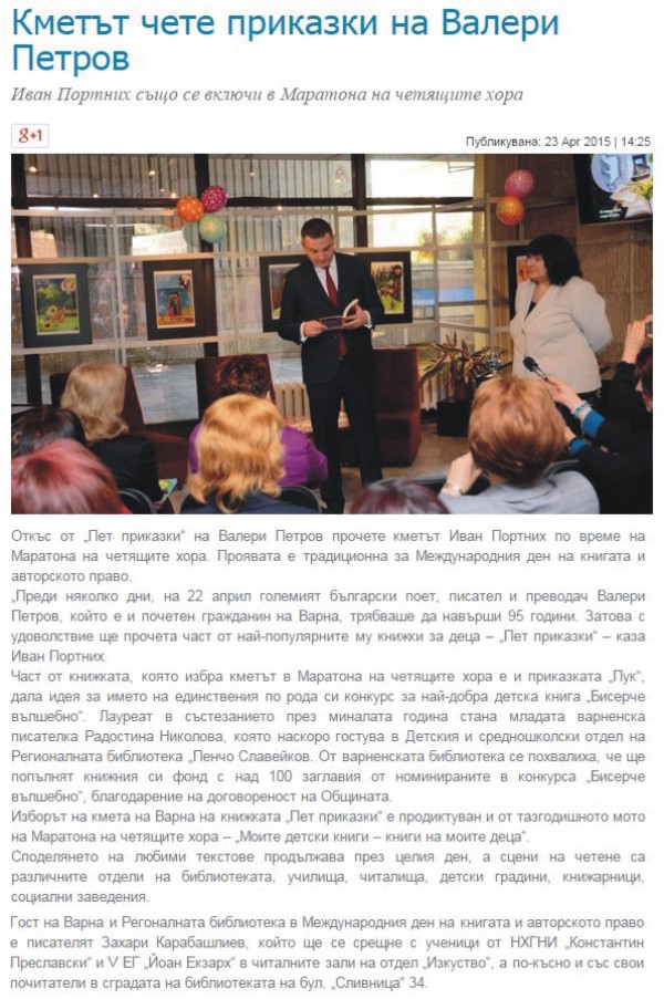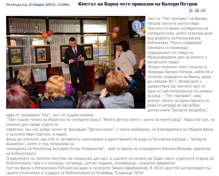 Кметът се включи в Маратона на четящите хора с приказка на Валери Петров. // news.varna24.bg, 23 април 2015