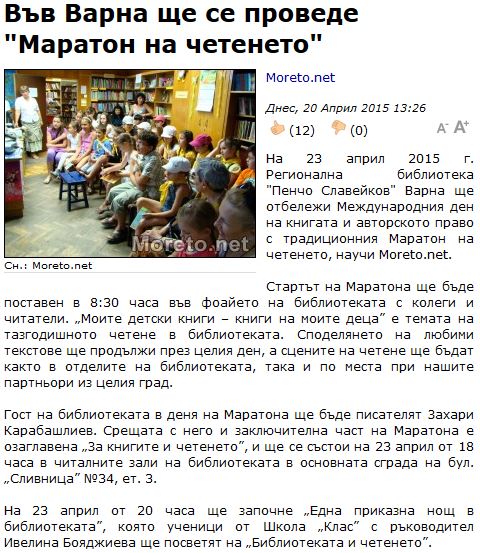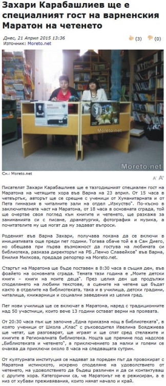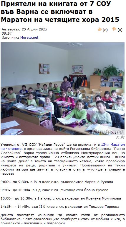 Приятели на книгата от 7 СОУ във Варна се включват в Маратон на четящите хора 2015. // Moreto.net, 23 април 2015