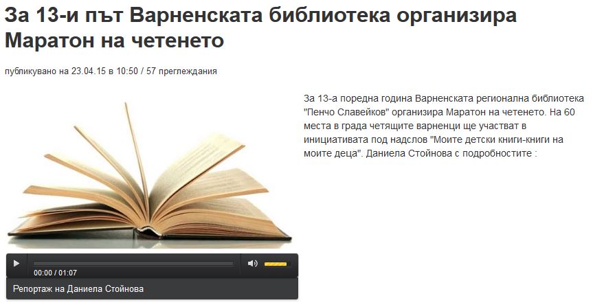 Стойнова, Даниела. За 13-ти път Варненската библиотека организира Маратон на четенето // bnr.bg, 23 април 2015