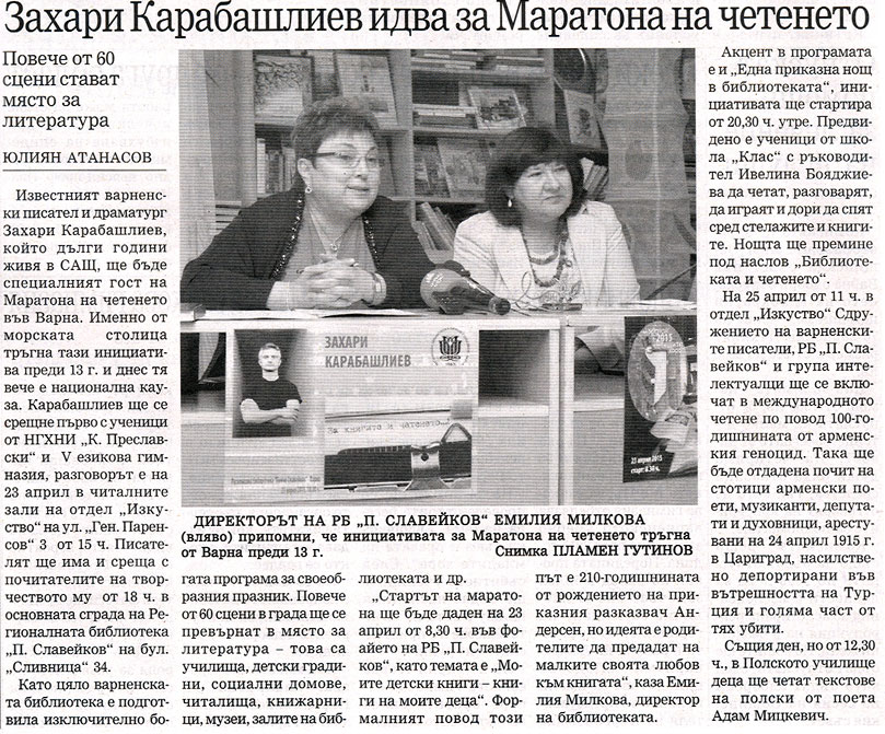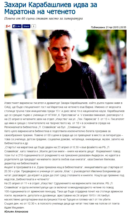 Атанасов, Юлиян. Захари Карабашлиев идва за Маратона на четенето : Повече от 60 сцени стават място за литература / Юлиян Атанасов. // Черно море (Варна), XVII, N 74, 22 апр. 2015, с. 4.