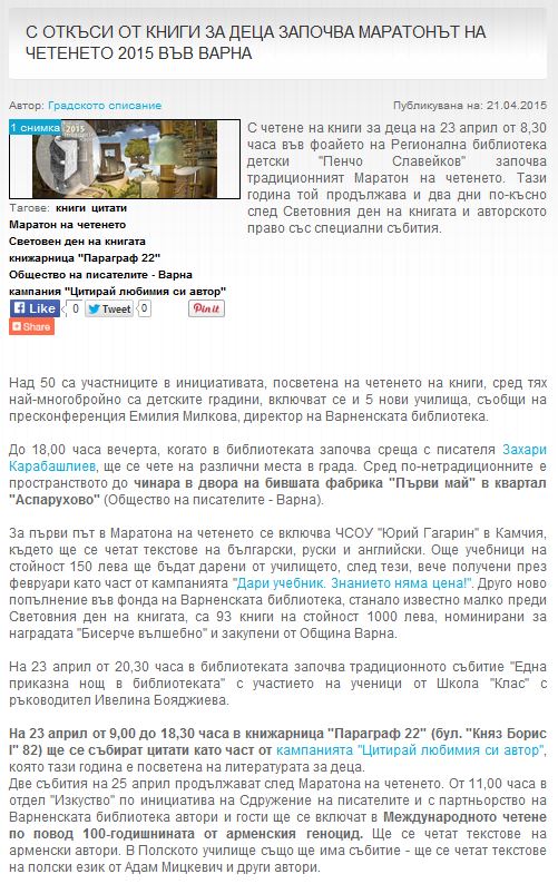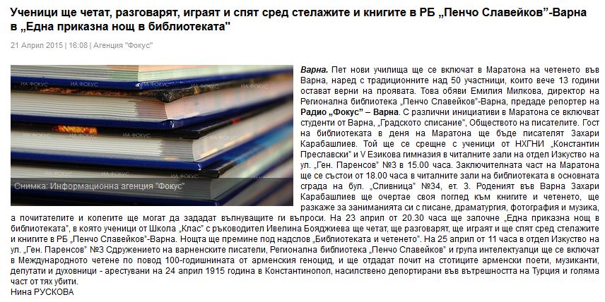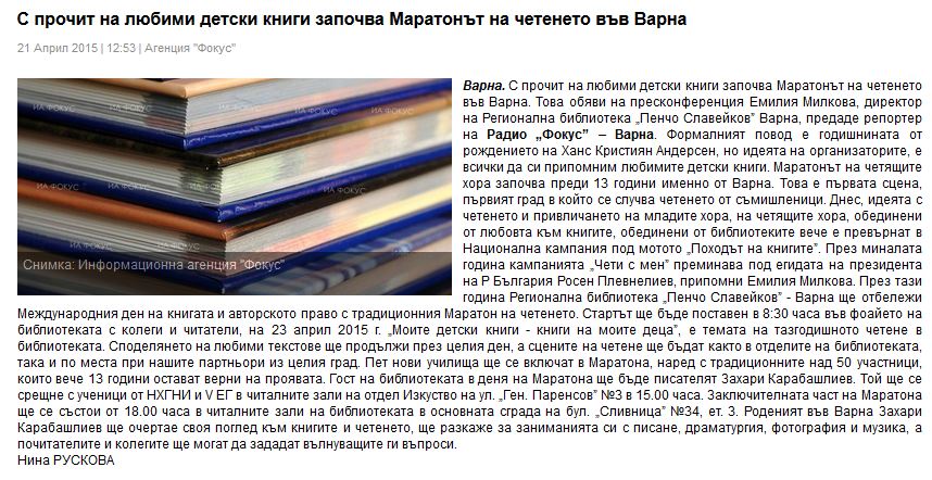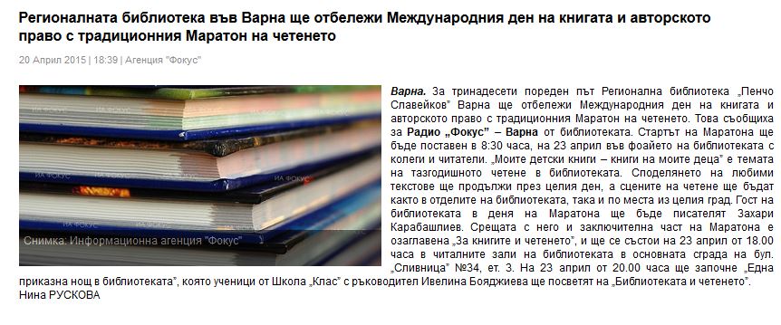 Рускова, Нина. Регионалната библиотека във Варна ще отбележи Международния ден на книгата и авторското право с традиционния Маратон на четенето. // Focus-news.net, 20 април 2015