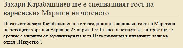Захари Карабашлиев ще е специалният гост на варненския Маратон на четенето. // Moreto.net, 21 април 2015