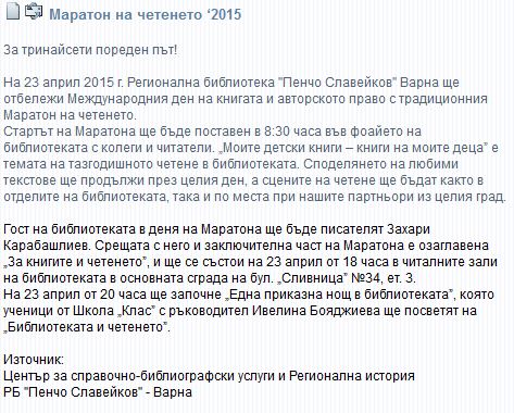 Маратон на четенето `2015 : За тринайсети пореден път. // Infovarna.com, 20 април 2015
