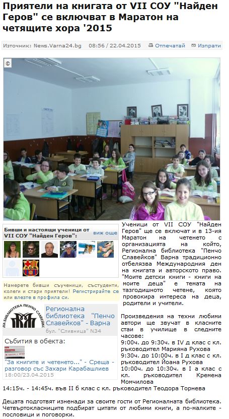Приятели на книгата от VII СОУ "Найден Геров" се включват в Маратон на четящите хора `2015. // News.varna24.bg, 22 април 2015
