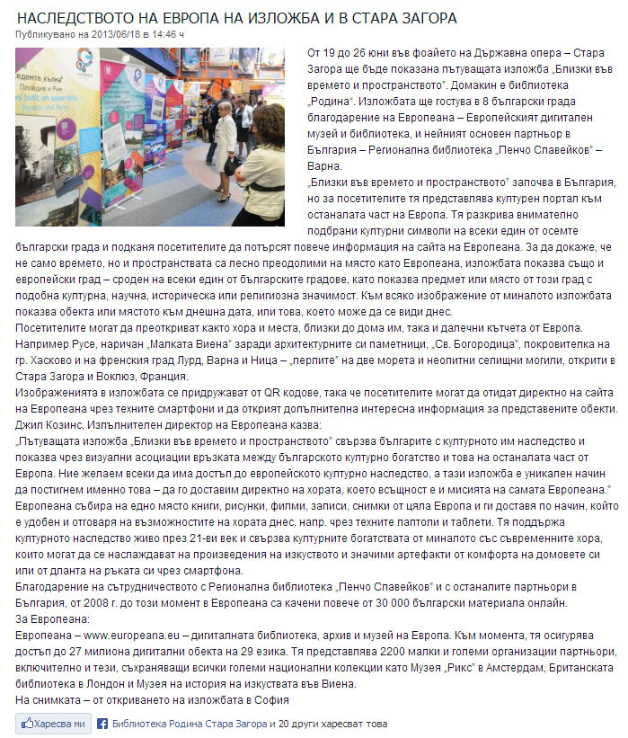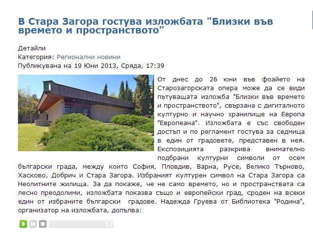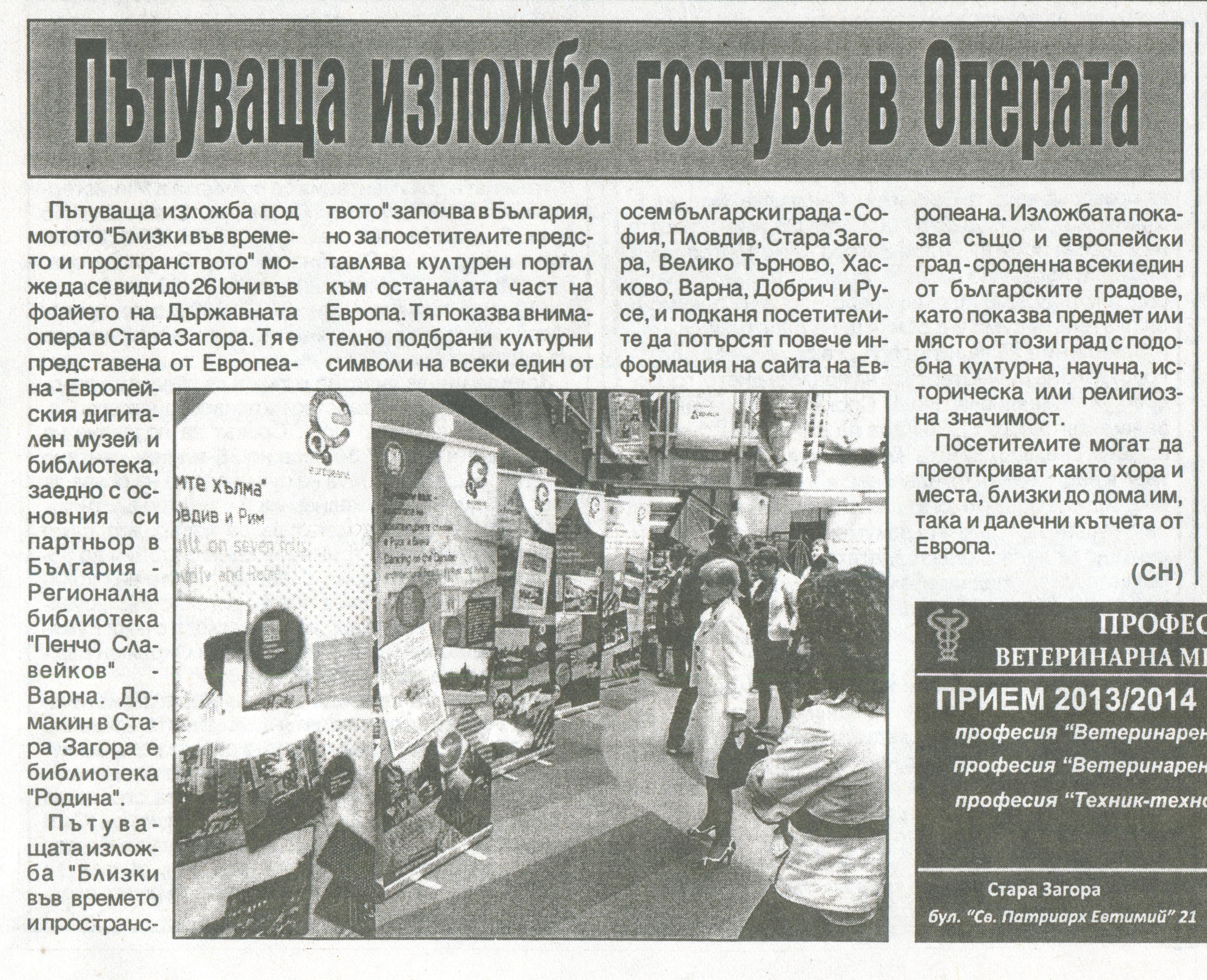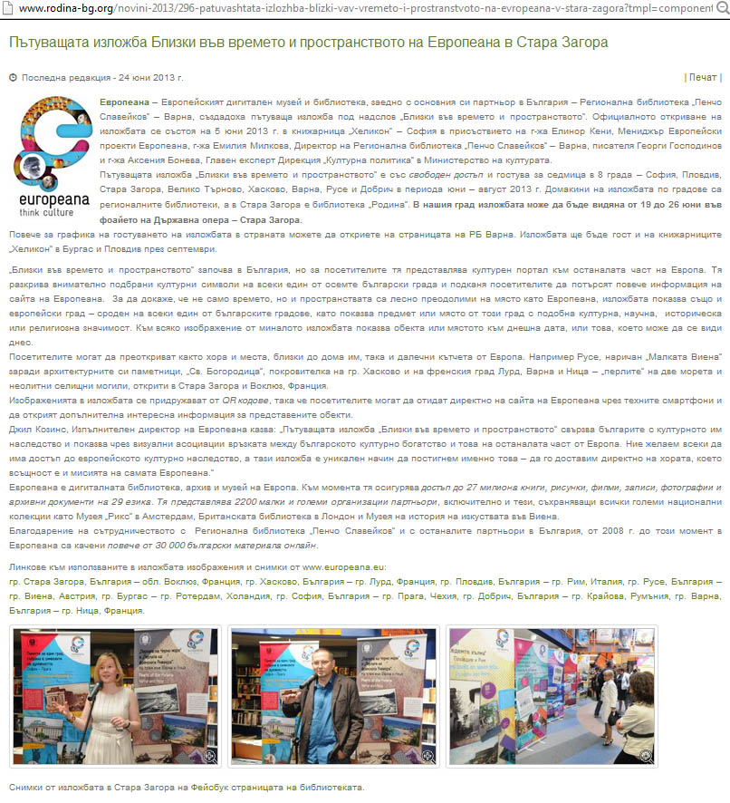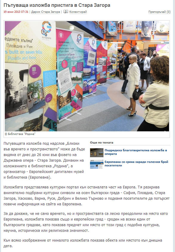 Европеана – пътуваща изложба „Близки във времето и пространството". // stara-zagora.org, 18 юни 2013. |
