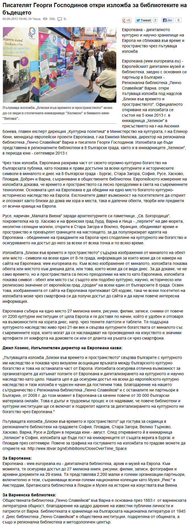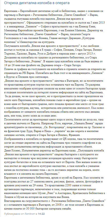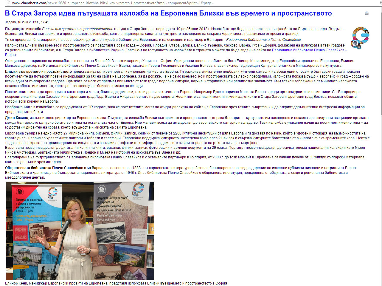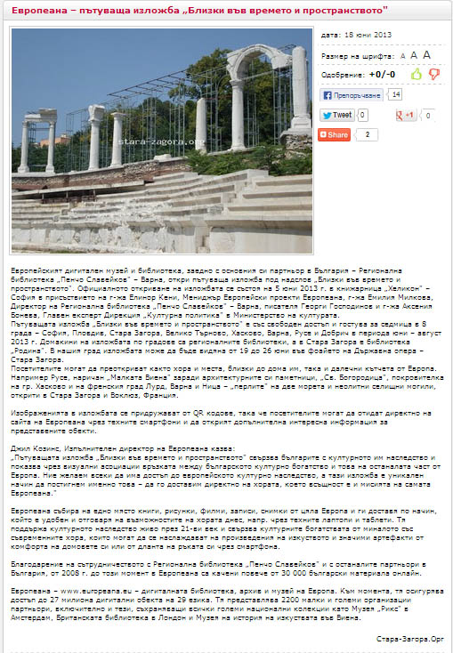 Европеана – пътуваща изложба „Близки във времето и пространството". // stara-zagora.org, 18 юни 2013. |