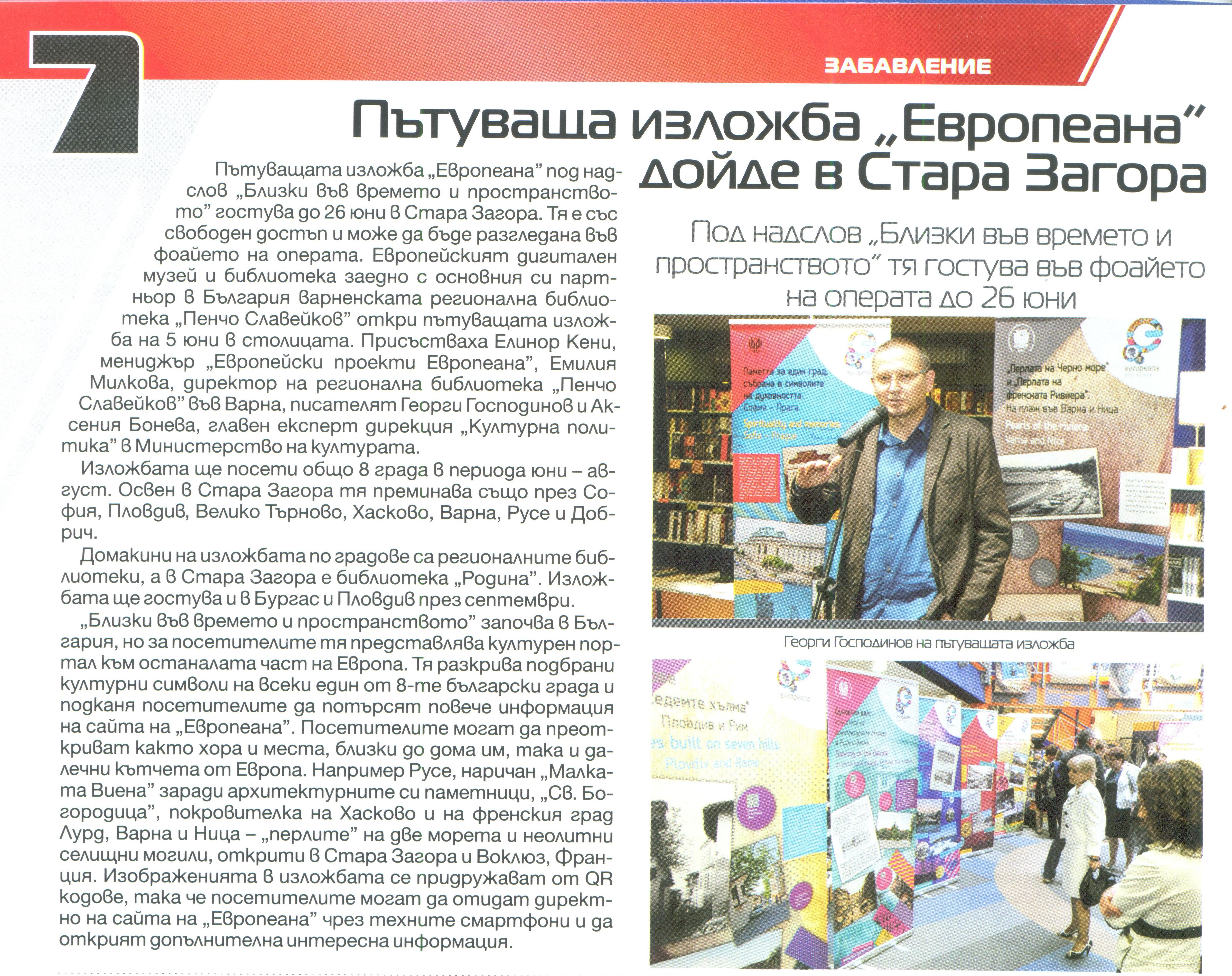Пътуваща изложба „Европеана” дойде в Стара Загора. // 7 дни (Стара Загора), ХVІІ, 2013, № 23, с. 32. |