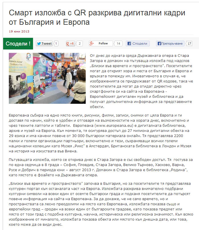 В Стара Загора идва пътуващата изложба на Европеана Близки във времето и пространството. // Икономически портал на регион Стара Загора, 16 юни 2013. |